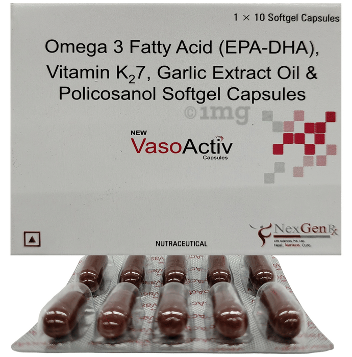 New Vasoactiv Capsule contains Omega 3 fatty acids, which aid to boost visual and brain health. It has garlic oil, which strengthens blood vessels. It is beneficial for supporting cardiac functions.