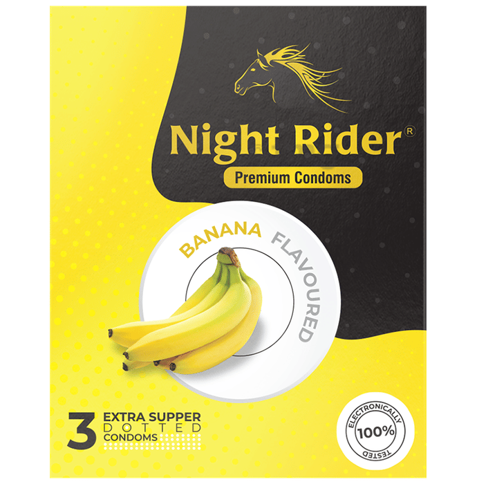 Night Rider Extra Super Dotted Condoms Banana Flavour Made with the finest rubber latex, these lubricated condoms are also 100% electronically tested. The finely designed raised dots are strategically positioned to provide additional pleasure. It provides more stimulation and sensation from the companion, prompting a more intense sexual reaction. It increases the amount of pleasure and gives both parties more satisfaction.