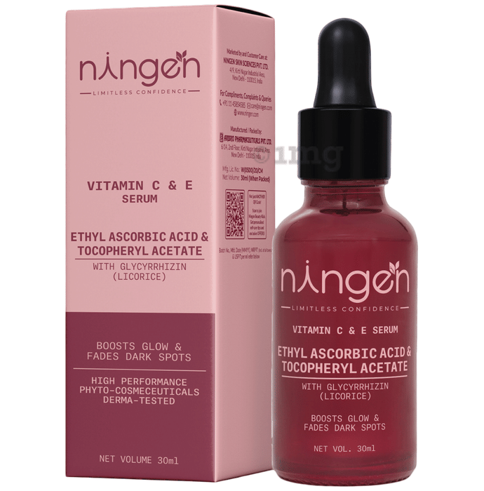 Ningen Serum Vitamin C & E is a cosmeceutical skincare formulation containing a blend of Ethyl Ascorbic Acid, Tocopheryl Acetate, Glycyrrhizin, and Aloe Vera. The Ethyl Ascorbic Acid can help support skin brightening and reduce dullness caused by oxidative stress. The Tocopheryl Acetate supports skin hydration and smoothness. The combination of these ingredients helps support skin clarity, even tone, and a radiant, supple appearance.