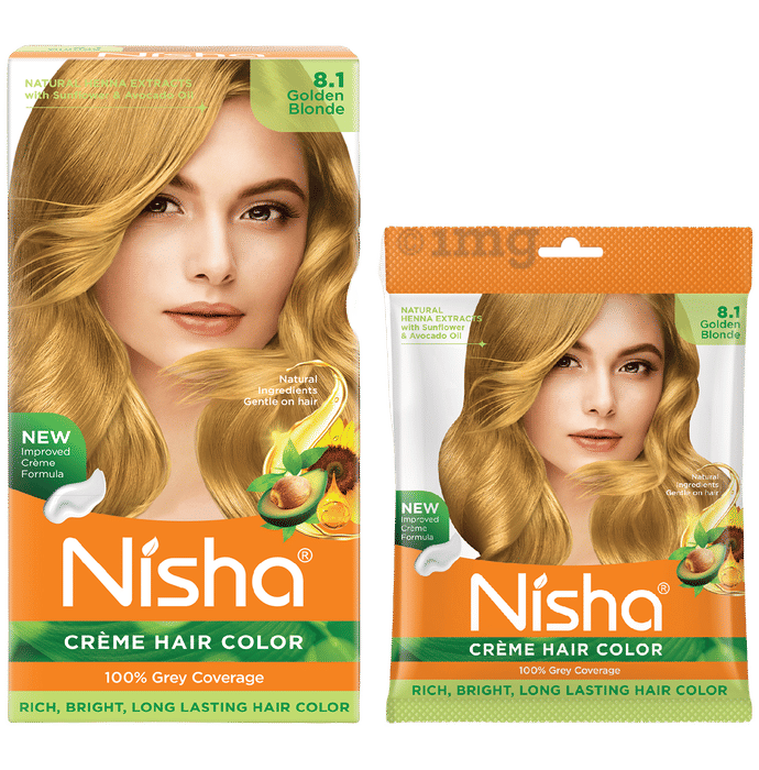 Nisha Combo Pack of Creme Hair Color (Box 120ml and Packet 40ml) 8.1 Golden Blonde