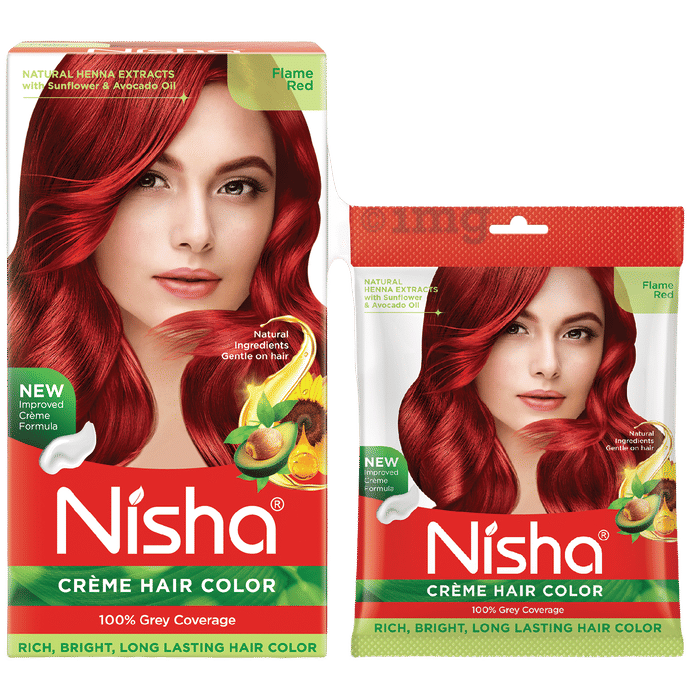 Nisha Combo Pack of Crème Hair Color (Flame Red) is a hair colour system formulated to provide natural flame red shade and shine. It includes a crème colourant, developer, and conditioner to support complete hair colouring and care in one pack. This hair colour is formulated with henna, avocado and sunflower extracts to protect and condition hair while delivering vibrant and even coverage. Ideal for achieving a flame red shade, it is designed to give you a salon-like finish at home.