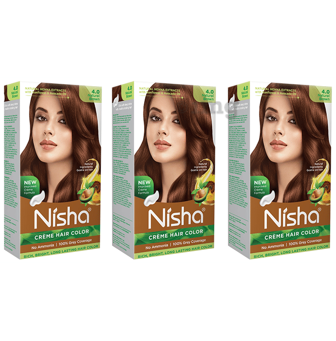 Nisha Creme Hair Color (120gm Each) 4 Natural Brown is a hair colour system formulated to provide natural brown shade and shine. It includes a crème colourant, developer, and conditioner to support complete hair colouring and care in one pack. The no-ammonia formula may help contribute to a gentle colouring experience.