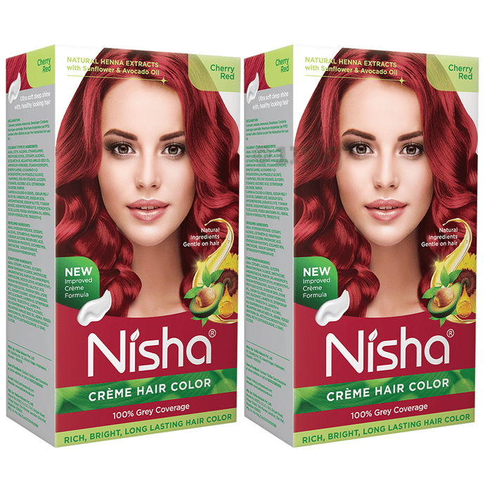 Nisha Creme Hair Color (120gm Each) Cherry Red is a hair colour system formulated to provide natural black cherry red shade and shine. It includes a crème colourant, developer, and conditioner to support complete hair colouring and care in one pack. This hair colour is formulated with henna, avocado and sunflower extracts to protect and condition hair while delivering vibrant and even coverage. Ideal for achieving a cherry red shade, it is designed to give you a salon-like finish at home.