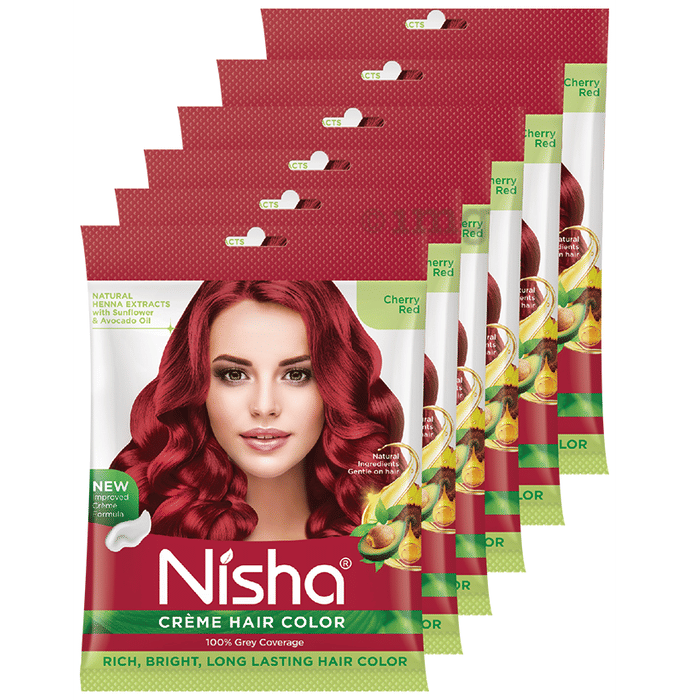 Nisha Creme Hair Color (40gm Each) Cherry Red is a cream-based hair colour enriched with Sunflower Oil, Avocado Oil, and Henna Extracts. The Cherry Red shade is designed to deliver a vibrant hue with even coverage from roots to tips. Its no-ammonia formulation is suitable for different hair types and may support softness and shine. Henna Extract may contribute to natural conditioning, while Sunflower Oil and Avocado Oil can help provide smooth texture and a shiny appearance. The included conditioner ensures post-colour care, leaving hair glossy and manageable after colouring.