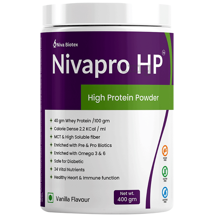 Nivapro HP Powder High Protein Vanilla is a calorie-dense, high-protein nutritional supplement scientifically formulated to help meet advanced nutritional needs for energy, strength, and daily vitality. The formulation is fortified with a comprehensive spectrum of 34 vital nutrients, including vitamins, minerals, dietary fibre, and essential fatty acids. This specialised product is designed to be suitable for adults in need of advanced nutrition and can be used both as an oral or enteral feeding solution under supervision. With the addition of MCT, prebiotics, probiotics, omega 3 and 6, and soluble fibre, Nivapro HP can help contribute to muscle nourishment, immune function, and overall metabolic well-being. Free from added sugar, lactose, and gluten, it can align well with modern therapeutic and wellness-oriented dietary plans.