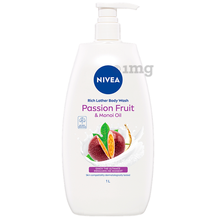 NIVEA Rich Lather Body Wash Passion Fruit & Monoi Oil is formulated to help offer gentle cleansing while leaving the skin nourished and smooth. This rich lather body wash combines a delicious Passionfruit scent with the moisturizing benefits of Monoi Oil, Glycerin, and Vitamins C & E to help ensure your skin remains hydrated and healthy. The pH-balanced formula can help support the skinโs moisture retention while ensuring balance with the skin's microbiome.