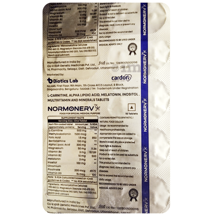 Normonerv is a nutritional formula designed as a support for nerve health. It contains alpha-lipoic acid and is formulated with melatonin, chromium picolinate, multivitamins, and minerals for nutritional benefits.