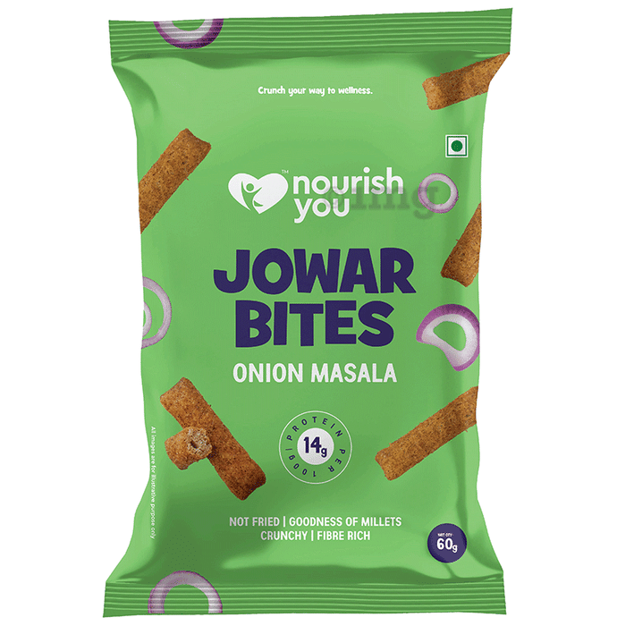 Nourish You Jowar Bites Onion Masala is a roasted snack made with a blend of jowar flour, foxtail millet, and brown rice. These crunchy bites are seasoned with onion masala to offer a savoury experience. Crafted without frying or refined wheat flour, they can be enjoyed on-the-go or as a tasty addition to your snacking routine.