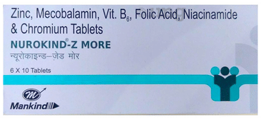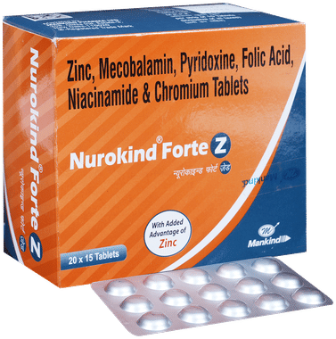 The Nurokind Forte Tablet contains Methylcobalamin, Zinc, Vitamin B6, Folic acid, Niacinamide and Chromium as its main ingredients.
