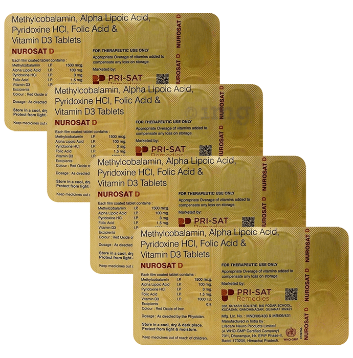 Nurosat D Tablet is formulated with a blend of essential vitamins and nutrients that can help support overall well-being. This supplement contains Methylcobalamin, Alpha Lipoic Acid, Pyridoxine HCl, Folic Acid, and Vitamin D3, which may help contribute to various physiological functions. Methylcobalamin, a bioactive form of Vitamin B12, may assist in maintaining nerve function and energy levels. Alpha Lipoic Acid is an antioxidant that can help support cellular protection. Pyridoxine HCl (Vitamin B6) may help support metabolic activity, while Folic Acid may help contribute to maintaining red blood cell formation. Vitamin D3, an essential nutrient, may assist in calcium absorption and bone health. This formulation is designed to help complement a balanced diet and may contribute to nutritional needs.