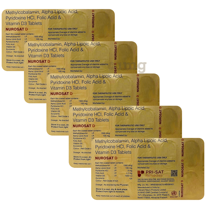 Nurosat D Tablet is formulated with a blend of essential vitamins and nutrients that can help support overall well-being. This supplement contains Methylcobalamin, Alpha Lipoic Acid, Pyridoxine HCl, Folic Acid, and Vitamin D3, which may help contribute to various physiological functions. Methylcobalamin, a bioactive form of Vitamin B12, may assist in maintaining nerve function and energy levels. Alpha Lipoic Acid is an antioxidant that can help support cellular protection. Pyridoxine HCl (Vitamin B6) may help support metabolic activity, while Folic Acid may help contribute to maintaining red blood cell formation. Vitamin D3, an essential nutrient, may assist in calcium absorption and bone health. This formulation is designed to help complement a balanced diet and may contribute to nutritional needs.