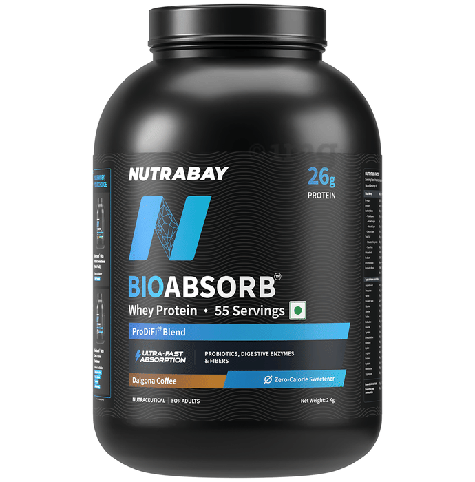 Nutrabay Bioabsorb Whey Protein Powder Dalgona Coffee is formulated with whey protein concentrate, digestive enzymes, prebiotics, and probiotics. It contains 26g of protein per serving and is designed with ultra-fast absorption technology. The product also contains naturally occurring sugars and is sweetened with sucralose as a zero-calorie sweetener.