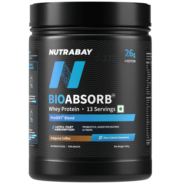 Nutrabay Bioabsorb Whey Protein Powder Dalgona Coffee is a bioavailable protein supplement designed to help support muscle growth, recovery, and gut health. It features Cross Flow Micro-filtered Whey Protein Concentrate, combined with ProDiFi complex, a synergistic blend of prebiotic fiber (FOS), 9-strain probiotic blend (50 billion CFUs), and digestive enzymes that can help support superior absorption and digestive comfort. With a smooth Kesar Badam Pista and zero added sugar, artificial preservatives, or anti-foaming agents, this vegetarian-friendly protein is ideal for athletes, fitness enthusiasts, and individuals focused on clean nutrition.