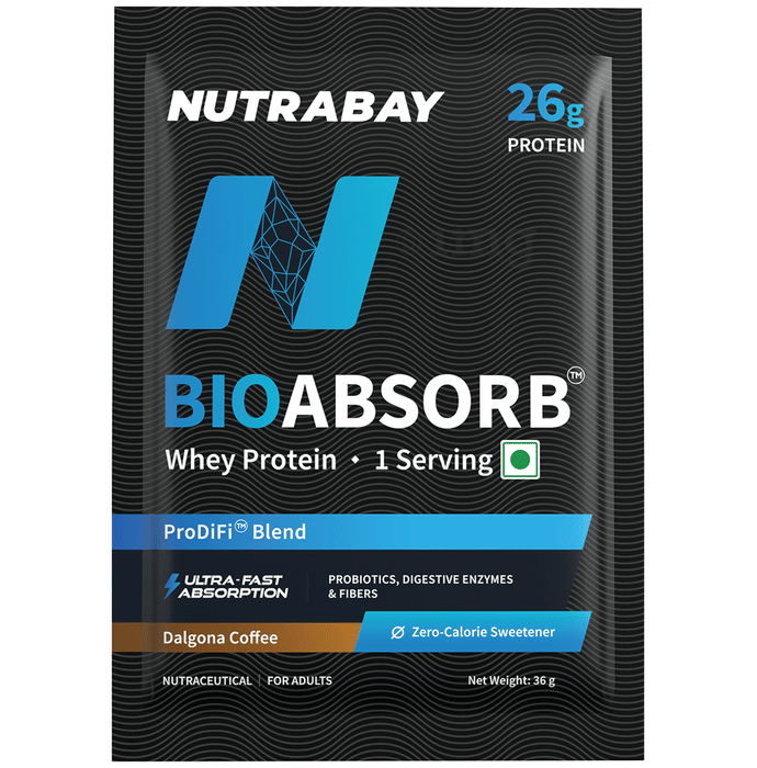 Nutrabay Bioabsorb Whey Protein Powder Dalgona Coffee is formulated with whey protein concentrate, digestive enzymes, prebiotics, and probiotics. It contains 26g of protein per serving and is designed with ultra-fast absorption technology. The product also contains naturally occurring sugars and is sweetened with sucralose as a zero-calorie sweetener.