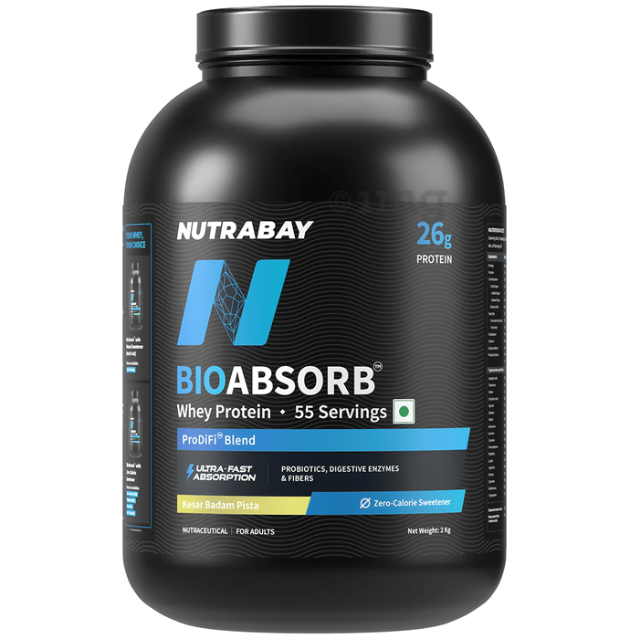 Nutrabay Bioabsorb Whey Protein Powder Kesar Badam Pista is formulated with whey protein concentrate, digestive enzymes, prebiotics, and probiotics. It contains 26g of protein per serving and is designed with ultra-fast absorption technology. The product also contains naturally occurring sugars and is sweetened with sucralose as a zero-calorie sweetener.