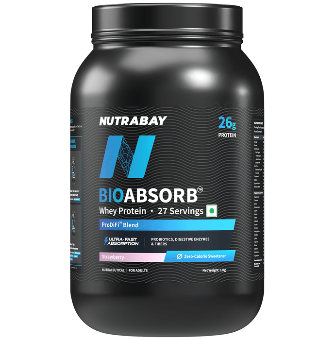 Nutrabay Bioabsorb Whey Protein Powder Strawberry is formulated with whey protein concentrate, digestive enzymes, prebiotics, and probiotics. It contains 26g of protein per serving and is designed with ultra-fast absorption technology. The product also contains naturally occurring sugars and is sweetened with sucralose as a zero-calorie sweetener.