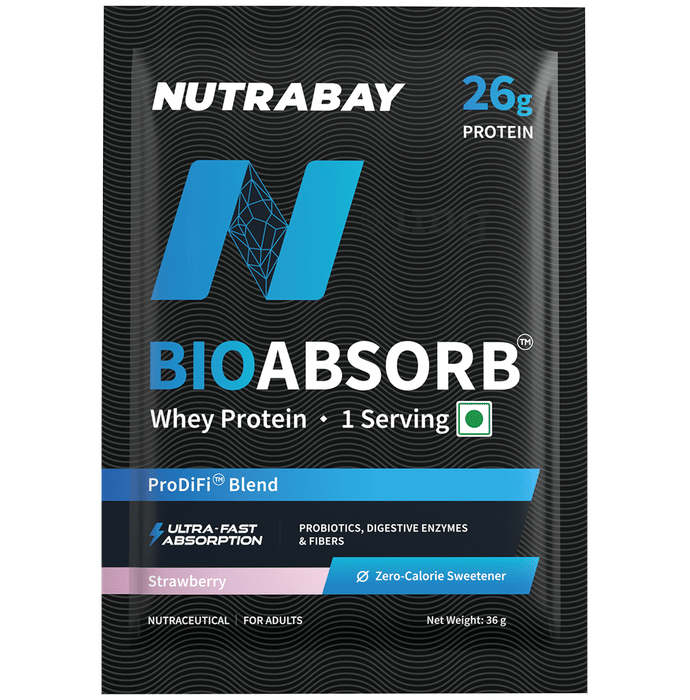 `Nutrabay Bioabsorb Whey Protein Powder Strawberry is formulated with whey protein concentrate, digestive enzymes, prebiotics, and probiotics. It contains 26g of protein per serving and is designed with ultra-fast absorption technology. The product also contains naturally occurring sugars and is sweetened with sucralose as a zero-calorie sweetener.