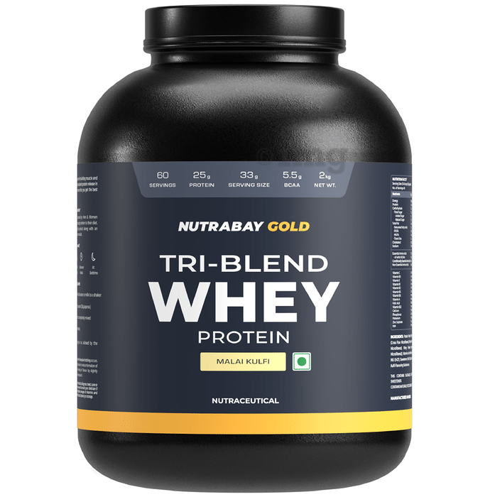 Nutrabay Gold Tri-Blend Whey Protein for Muscle Recovery & Immunity | No Added Sugar | Flavour Powder Malai kulfi