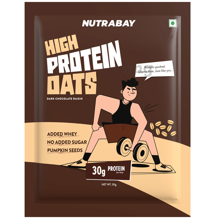 Nutrabay High Protein Oats Dark Chocolate Raisin No Added Sugar is a thoughtfully developed protein-packed breakfast cereal designed to align with your fitness nutrition goals. Enriched with a combination of instant oats, a high-quality protein blend (pea protein isolate and whey protein concentrate), pumpkin seeds, and black raisins, this formula can help deliver clean energy and steady nourishment to support muscle recovery and daily wellness. When prepared with 250 ml of milk, it provides 22.5 g of protein per 50 g serving, making it a delicious and filling option for breakfast, post-workout recovery, or even a satiating snack between meals. This formulation is free from added sugar, preservatives, and artificial flavours—crafted to be non-GMO, gluten-free, and suitable for vegetarians. Its indulgent dark chocolate raisin flavour pairs well with fruits, nuts, and seeds, offering versatility in every bowl.
