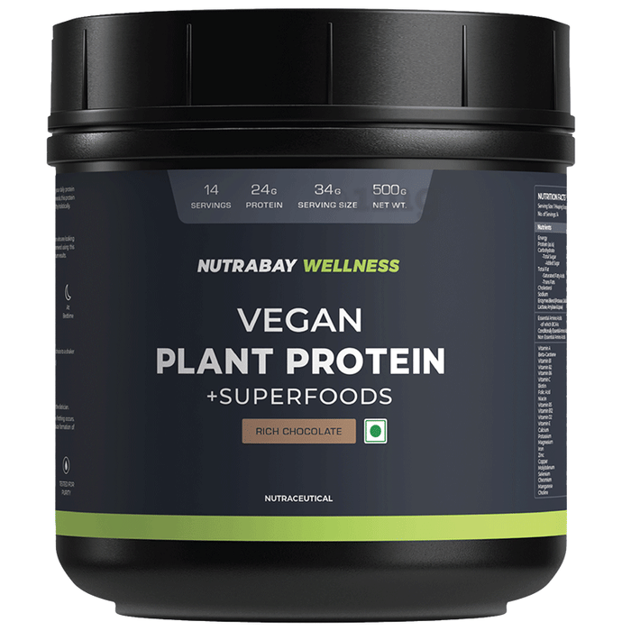Nutrabay Wellness Vegan Plant Protein + Superfoods Rich Chocolate is made with pea protein, brown rice protein, and vitamins and minerals that might help to maintain the body holistically. It is vegetarian and is manufactured in India.