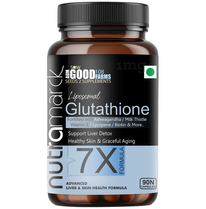 NutraMarck Glutathione Capsule is crafted with a 7X advanced formula to help support liver detoxification and promote healthy, radiant skin. Fortified with powerful ingredients such as Liposomal Glutathione, Milk Thistle, Ashwagandha, Vitamin E, Lycopene, Biotin, and Black Pepper, these capsules can help combat oxidative stress, improve skin complexion, and support graceful ageing. Designed to help promote liver health, reduce pigmentation, and provide antioxidant protection, Nutramark Liposomal Glutathione can help maintain overall vitality and wellness.
