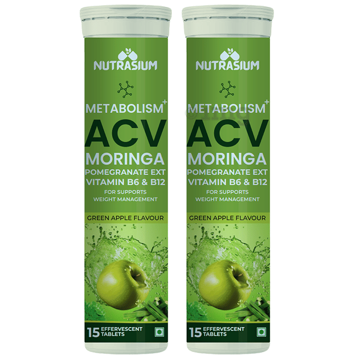 Nutrasium Metabolism ACV Moringa Effervescent Tablet is a dietary supplement containing Apple Cider Vinegar, Pomegranate Extract, Moringa Extract, Vitamin B6, and Vitamin B12. It is designed to support metabolism, digestion, and nutritional needs. The formulation can help manage gut health, maintain energy balance, and support daily wellness.