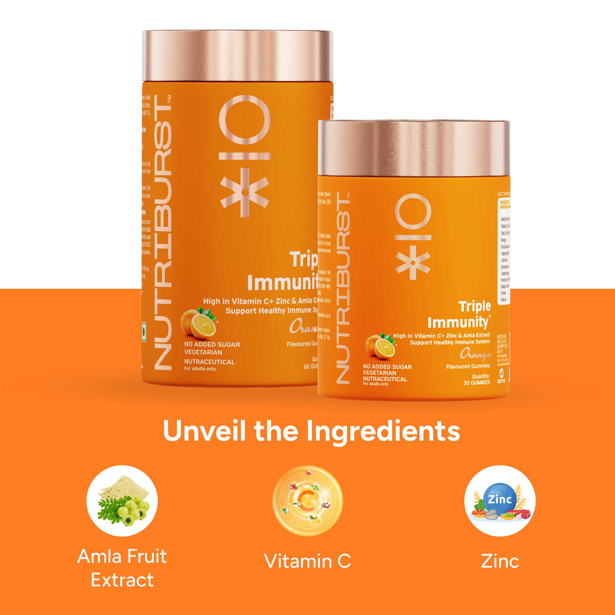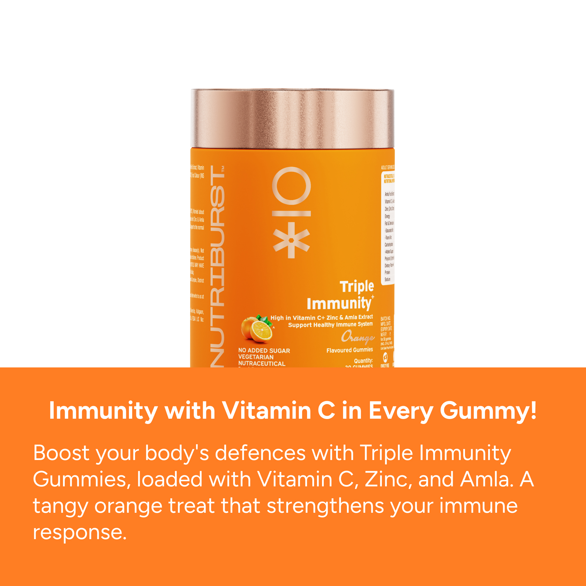 Nutriburst Triple Immunity Gummies Orange Embark on a journey to fortified immunity with Nutriburst Triple Immunity Gummies, your daily dose of wellness packed into delightful bites. These gummies are more than just supplements; theyre a powerhouse of vitamin C, zinc, and amla extract, meticulously blended to support your immune system and overall vitality. Crafted with cleanliness and quality as top priorities, Nutriburst promises a delicious, plant-based experience, free from added sugars and gluten. Immerse yourself in the goodness of nature, as each gummy contributes to a resilient immune system and provides antioxidants for overall well-being. Elevate your health with a burst of nutrients in every bite – because, at Nutriburst, we believe that great health is a right for everyone.
