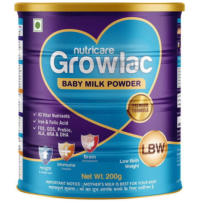 Nutricare Growlac Baby Milk Powder LBW is a specially designed formula for infants born before 37 weeks or with low birth weight (below 2.5 kg). It provides 43 vital nutrients including iron, folic acid, essential fatty acids (ALA, ARA, DHA), and prebiotics (FOS, GOS, Prebio) that can help meet the nutritional needs of such infants. With added choline, taurine, L-carnitine, nucleotides, and carefully balanced protein, this formula may support weight gain, immune function, and brain development. It is developed to be safe, digestible, and suitable for delicate infants under healthcare supervision. While Growlac LBW can provide supplemental nutrition, it is important to remember that mother’s milk is best for babies and should always be prioritised whenever possible.