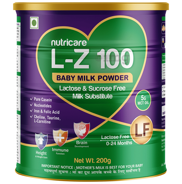 Nutricare L-Z 100 Baby Milk Powder (0-24 Months) Lactose Free is a lactose and sucrose free infant milk substitute, specially designed for infants from birth up to 24 months who require an alternative to breast milk under medical supervision. It contains pure casein, nucleotides, iron, folic acid, choline, taurine, and L-carnitine along with added MCT (medium chain triglyceride) oil to provide balanced nourishment. The formula can help provide essential nutrients to support growth, brain development, immune function, and energy requirements during infancy. While Nutricare L-Z 100 can serve as a supplementary source of nutrition under healthcare guidance, it is important to remember that mother’s milk is best for babies and should always be prioritised whenever possible.