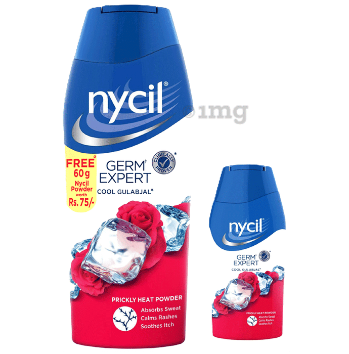 - Nycil Cool Gulabjal Prickly Heat Talcum Powder with Nycil Cool Herbal 50gm Free is suitable for all skin types and comes in assorted fragrances