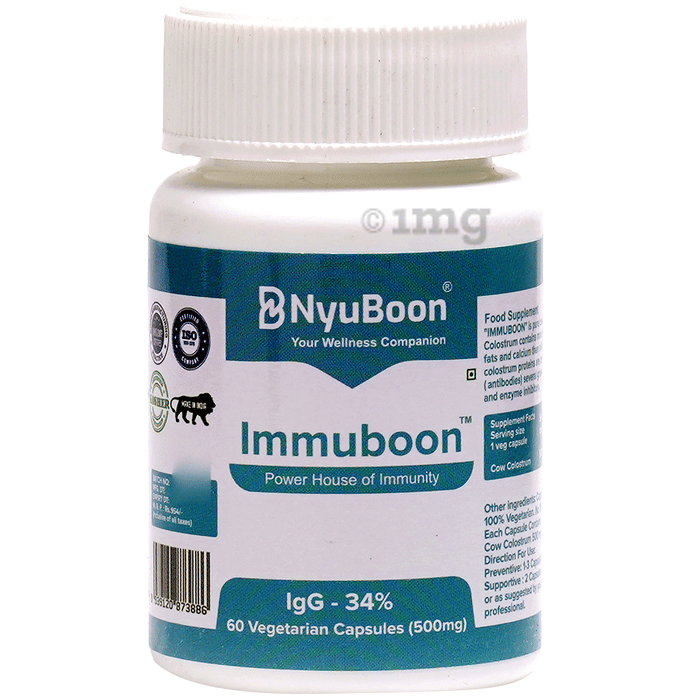 NyuBoon Immuboon Veg capsule is a food supplement formulated with pure cow colostrum to support immune health and overall well-being. Colostrum is a rich source of immunoglobulins, proteins, and essential nutrients that can help strengthen the body's natural defences. This supplement is designed to provide 34% IgG (Immunoglobulin G), supporting immune function while also promoting gut health and energy metabolism. It contains a powerful blend of growth factors, enzymes, and proteins, making it an excellent choice for individuals looking to maintain optimal immunity, vitality, and digestive balance. Each capsule contains 500 mg of pure cow colostrum, ensuring the highest quality and efficacy.