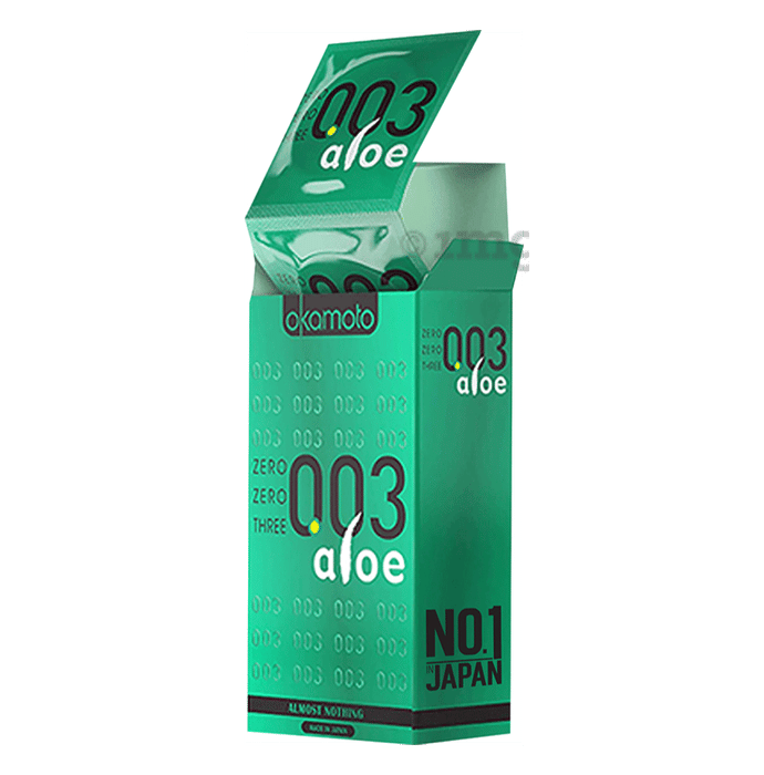 Okamoto 0.03 Aloe Condom: Okamoto 0.03 Aloe Condom are crafted for a gentle and refined experience. With a thinness of around 0.03 mm, they offer a close feel and consistent smoothness from base to tip. These natural latex condoms are shaped to provide a comfortable fit and are infused with water-based lubricant and aloe essence. Each unit undergoes electrostatic testing to support quality standards. The Sheerlon latex material is soft and odour-neutral, offering a sleek and non-irritating texture. Uses: This product is designed to be used as a contraceptive. Product Specifications And Features: