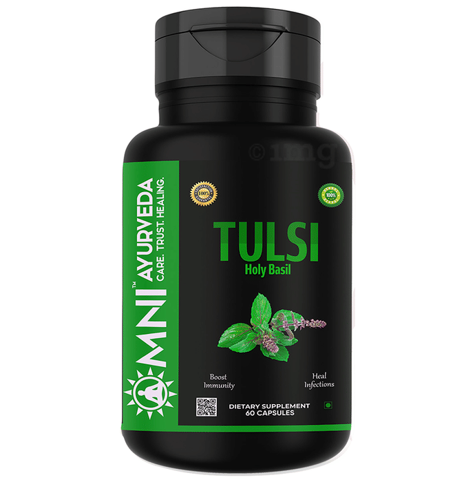 Omni Ayurveda Tulsi Holy Basil Capsule is a dietary supplement that contains 800 milligrams of tulsi (holy basil) extract per capsule. Tulsi, also known as the "queen of herbs" or "holy basil," is a herb that is commonly used in traditional ayurvedic medicine for cough, cold, sore throat, microbial infections, and inflammations and for improving the bodys immunity.
