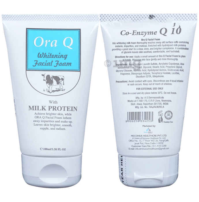 Ora Q Whitening Facial Foam thoroughly washes away dead skin cells containing melanin, impurities, and makeup. It is enriched with hydrolysed milk proteins that make the complexion clear, bright, and even-toned. A combination of glycerin leaves the skin soothed, comfortable, and hydrated.