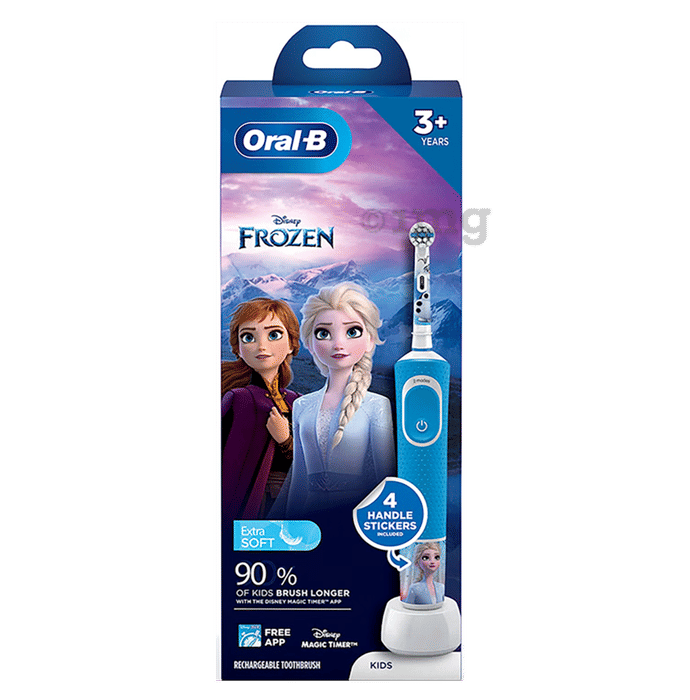Oral-B Kids Electric Rechargeable Toothbrush (for 3+ Years) Frozen features Disney Frozen characters, making brushing a fun activity for kids. The toothbrush has extra soft bristles and compatible with the Disney magic timer app by Oral-B.