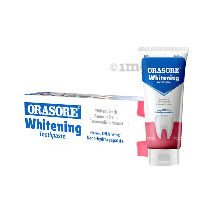 Orasore Whitening Toothpaste is an oral care formulation designed to support complete dental hygiene while helping whiten teeth, and maintain fresh breath. Enriched with Nano-Hydroxyapatite, herbal extracts like Neem, Babul, Miswak, Clove, Tulsi, and Peppermint, along with gentle cleansing agents, it helps clean teeth effectively while supporting enamel remineralisation and gum health. This fluoride-free, peroxide-free, and sugar-free toothpaste provides daily protection against cavities, sensitivity, and oral odour while promoting a brighter smile.
