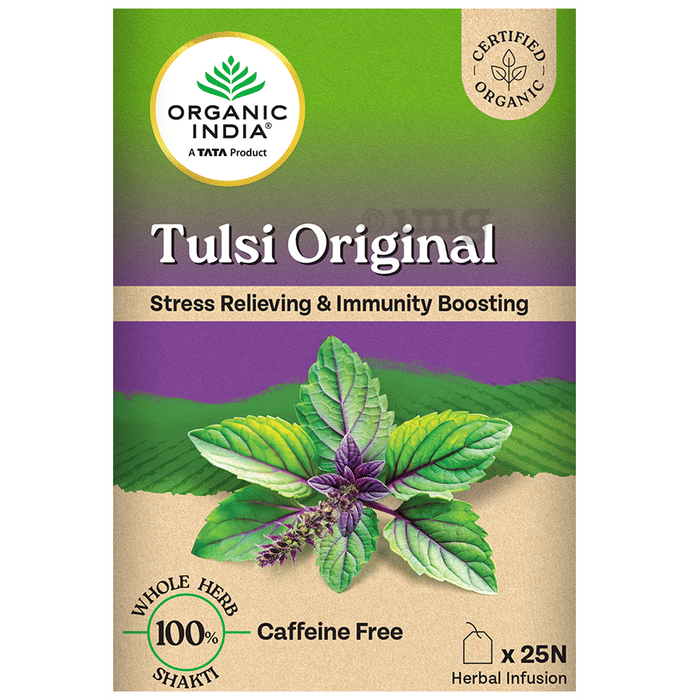 Organic India Original Tulsi Green Tea has several health benefits. Tulsi is known for its antioxidant, anti-inflammatory, and adaptogenic properties. Green tea is known for its rich source of antioxidants called catechins, which help promote heart health, boost metabolism and immunity, and improve brain function. Together, they help improve overall health.