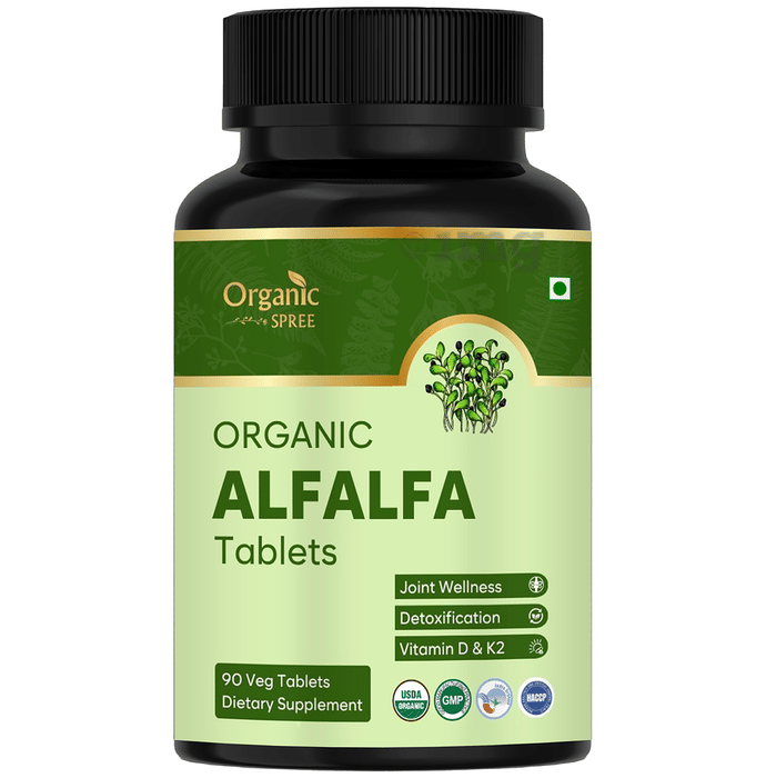 Organic Spree Alfalfa Tablet is a supplement made with ingredients that can help support joint wellness, vitamin D and K2 supply, and internal detox function. These tablets are designed to assist in maintaining overall vitality and contribute to internal balance. Rich in vitamins and minerals, Alfalfa can also help in better digestion, detoxification, and overall energy.