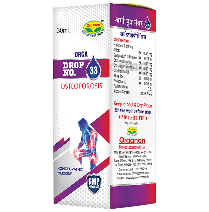 Organon Orga Drop No 33 Osteoporosis supports bone health, helps manage bone pain and may assist in relieving bone-related ailments. It can be useful in calcium absorption and bone formation, contributing to overall bone strength and quality.