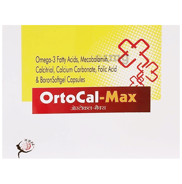 Ortocal Max Capsule is a bone and joint health supplement. It is formulated with calcitriol, omega-3 fatty acids, methylcobalamin, folic acid, boron, and calcium, which can help maintain bone strength and aid in better joint flexibility. Calcitriol helps improve bone health, omega-3 fatty acids promote joint health, methylcobalamin and folic acid aid in red blood cell production, and calcium is vital for bone health.
