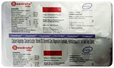 Osedrate Tablet is a dietary supplement containing calcium, vitamin D3, zinc, magnesium, hydroxocobalamin, and folic acid, which can help build bone and teeth strength and improve calcium absorption. It may aid in boosting the immune system and red blood cell production.
