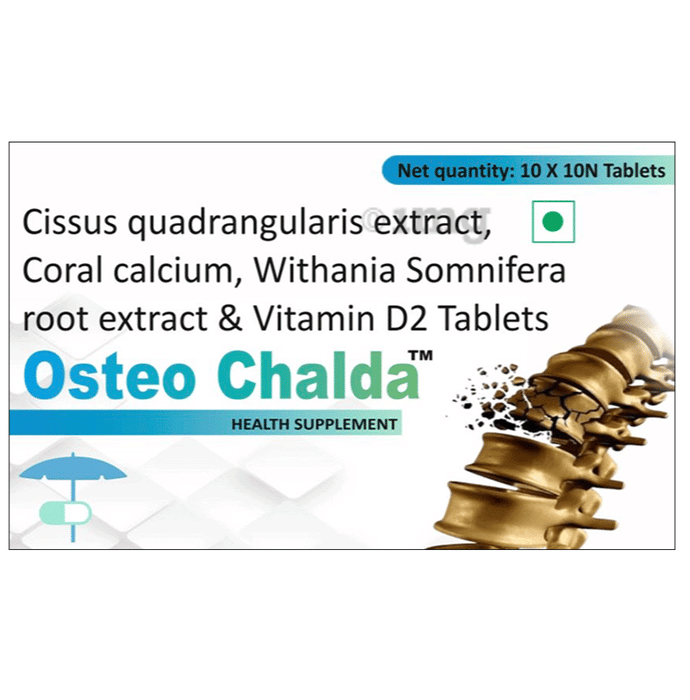 Osteo Chalda Tablets (10 Each) is a food supplement in tablet form designed to provide nutritional support for bone and musculoskeletal health. Each tablet contains a blend of plant extracts, minerals, and vitamins including Cissus quadrangularis extract, Coral Calcium, Withania somnifera root extract, and Vitamin D2. These components may help support bone mineral content, calcium absorption, and cellular processes associated with bone function. With the inclusion of Magnesium, Zinc, and Manganese, the formulation offers multi-mineral support for overall skeletal health. The presence of Ashwagandha extract may assist in contributing to general well-being. This product is intended to be used as a supplement to the diet and lifestyle, and should be consumed under the guidance of a healthcare professional.