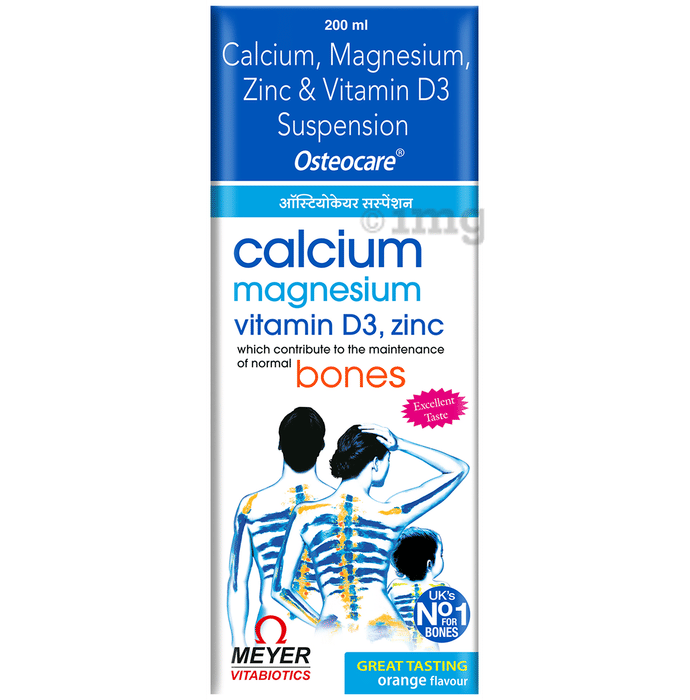 Osteocare Suspension is a health tonic for kids and adults which helps in achieving higher bone mass. Enriched with calcium, magnesium, zinc and Vitamin D3, the syrup helps in building strong bones. It is useful in preventing rickets in children due to its calcium and vitamin D components that help maintain optimum levels. Vitamin D is essential as it assists in calcium absorption. The minerals manganese and zinc help in bone mineralisation and transport of calcium in the body. It also prevents tooth decay in children and makes the teeth strong and healthy.