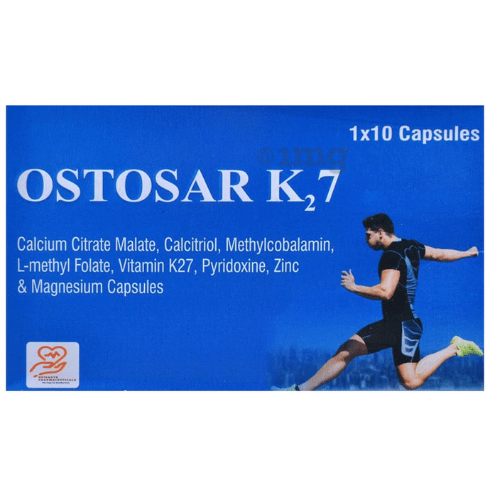 Ostosar K27 Capsule is a comprehensive dietary supplement formulated with a synergistic blend of calcium, vitamins, and minerals to support bone strength, mineral balance, and overall wellness. Each hard gelatin capsule delivers highly bioavailable forms of calcium, vitamin D, K2-7, B12, folate, zinc, magnesium, and vitamin B6, making it suitable for adults seeking to maintain bone health and optimal nutritional status.