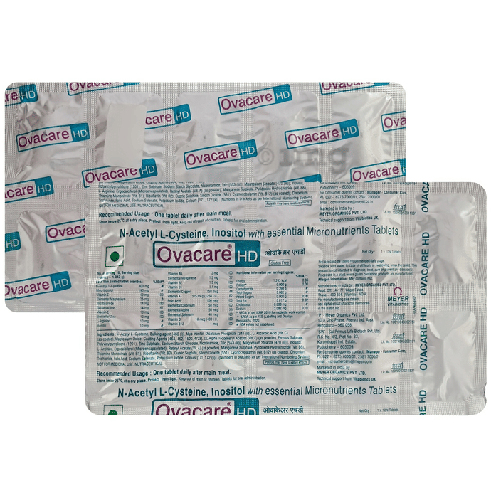 Ovacare HD Tablet is a perfect dietary supplement for female that helps in overall development and growth. It is a multivitamin and multimineral supplement help in cell growth and maintenance. It is useful in performing normal body functions, make up the deficiencies in the body and protection of cells from wear and tear. It helps in promoting the blood production in body.