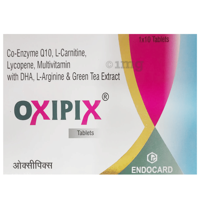 Oxipix Tablet is a nutraceutical formulation designed to support overall wellness by providing essential nutrients and bioactive compounds. Each tablet combines Co-Enzyme Q10, L-Carnitine, L-Arginine, DHA, Lycopene, Green Tea Extract, and a range of B-complex vitamins along with Vitamin E and Zinc. This combination provides nutrients that contribute to energy metabolism, antioxidant defense, and cellular function. With carefully measured amounts of each ingredient, Oxipix can complement a balanced diet and lifestyle to maintain general vitality. It is suitable for individuals looking to support heart health, metabolic activity, and daily nutritional requirements.