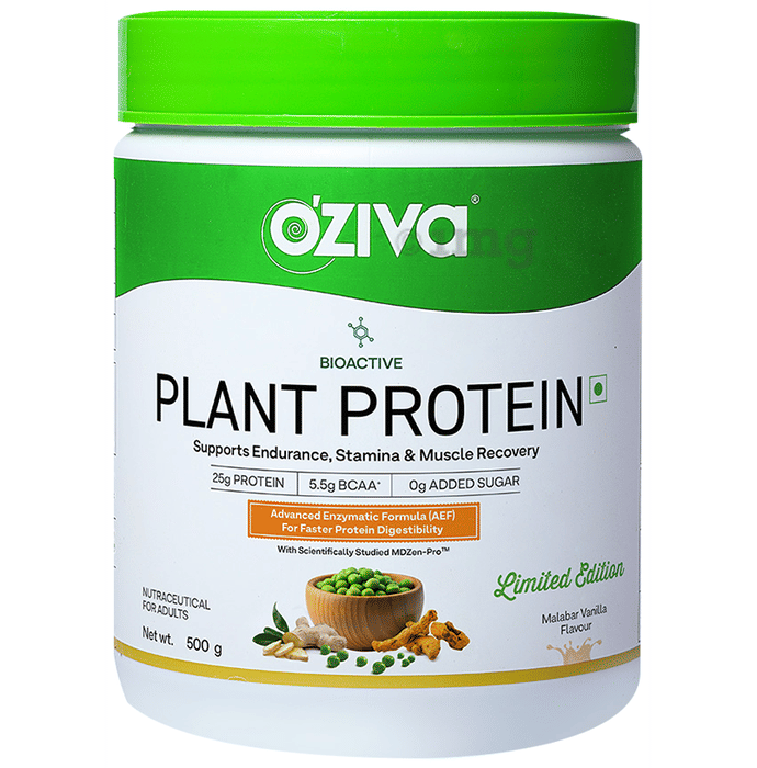 Oziva Bioactive Plant Protein Powder Malabar Vanilla No Added Sugar is a nutraceutical supplement formulated with pea protein isolate and enriched with natural ingredients such as turmeric and ginger extract. Each serving provides 25 g of protein and 5.5 g of BCAAs, making it suitable for individuals who want to support their daily protein intake in a clean and plant-based form. The inclusion of MCT powder, fibre, and digestive enzymes ensures that the product can help with energy metabolism, digestion, and overall nutritional balance. With zero artificial sweetener and a gluten-free, soy-free, and non-GMO formulation, it is designed to align with wellness-focused dietary choices.