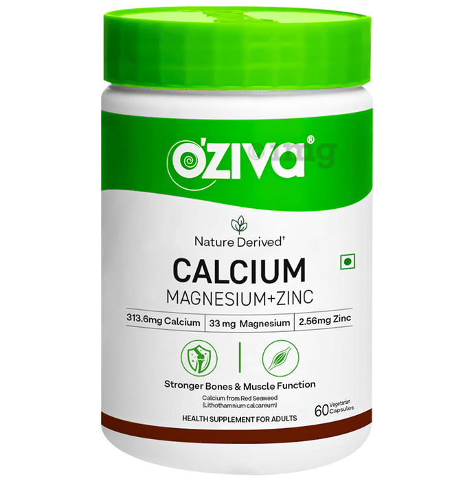 Oziva Calcium Magnesium + Zinc Vegetarian Capsule is a plant-derived health supplement formulated with calcium from red seaweed (Lithothamnium calcareum), magnesium from magnesium hydroxide, zinc from guava leaf extract, and vitamin D3 derived from lichen. This combination can help support bone strength, muscle function, and overall structural wellness. The synergy of these essential nutrients may also contribute to calcium absorption, bone cell regeneration, and maintenance of healthy metabolism, making it suitable for adults looking to support long-term skeletal health and mobility.