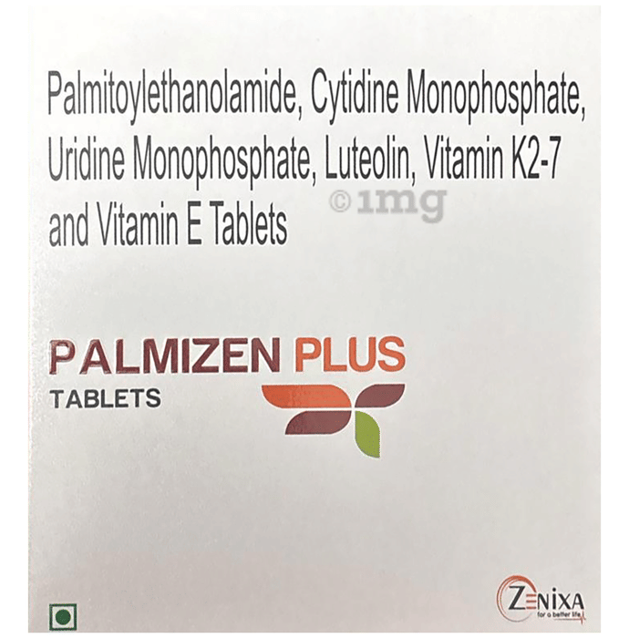 Palmizen Plus Tablet is a dietary supplement that may support nerve function, reduce inflammation, and promote cellular health. Enriched with Palmitoylethanolamide (PEA), Cytidine and Uridine Monophosphates, and antioxidants like Luteolin, Vitamin K2-7, and Vitamin E, this formulation can help maintain cognitive balance, reduce oxidative stress, and support myelin repair. It is ideal for individuals experiencing cognitive discomfort and decline, or inflammatory conditions, providing a comprehensive approach to nerve and cellular wellness.