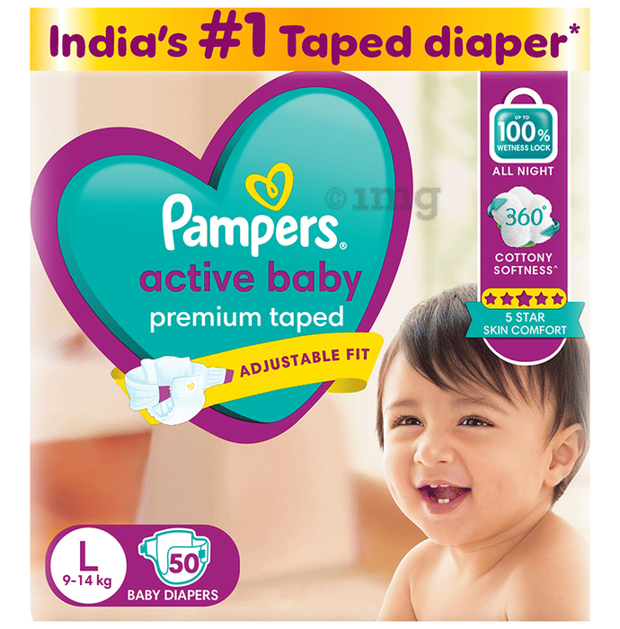 Pampers Active Baby Diaper is a conventional cloth diaper. These disposable baby diapers protect the baby's skin from continuous wetness. The diaper is gentle and safe on the baby’s skin, with a breathable cover, comfortable fit, and cottony softness. It is infused with baby lotion, which helps prevent odour from escaping and has up to 12-hour dryness.